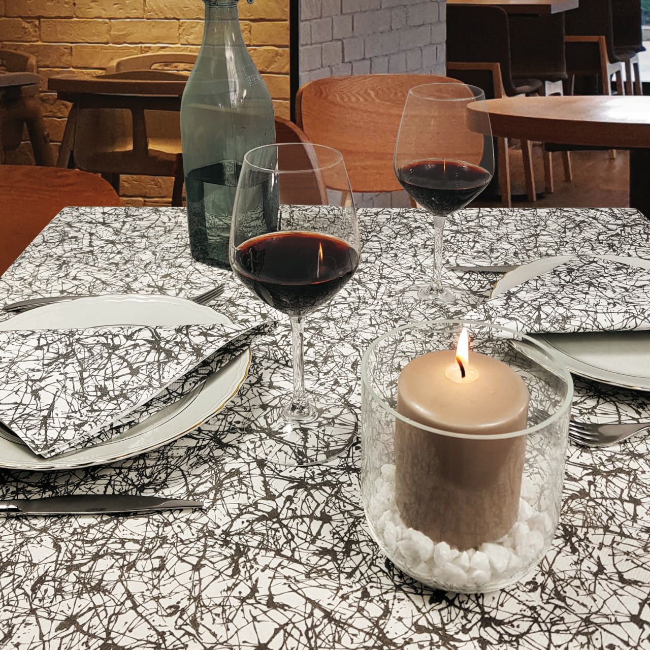 Pollock è una fantasia ispirata all’omonimo pittore statunitense, di cui ricorda le opere. Se il tuo locale è di ispirazione artistica non puoi fare a meno di arredare i tuoi tavoli con tovaglie e tovaglioli di questa serie.