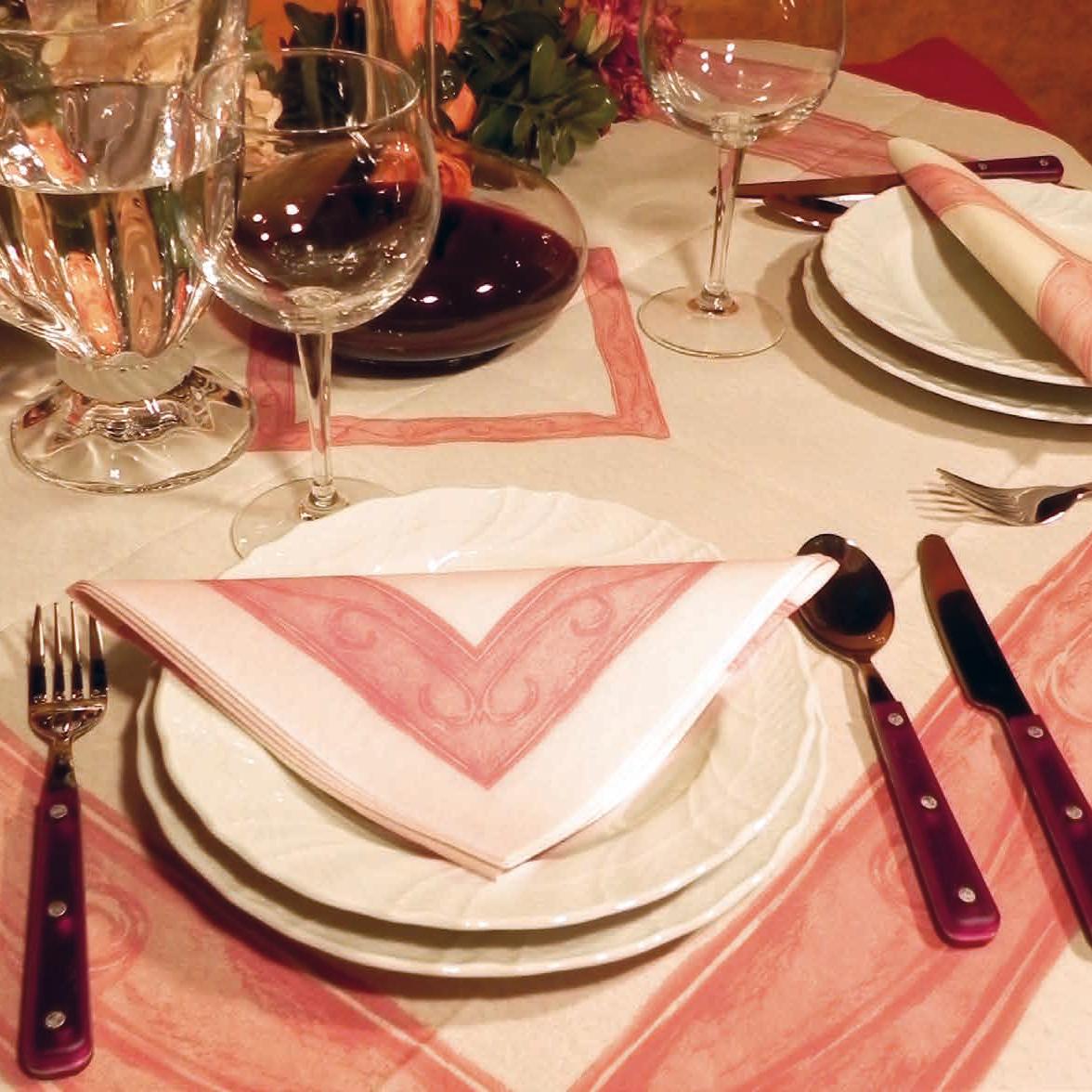 Tovaglia monouso con disegni e bordature che ricordano antiche decorazioni architettoniche.